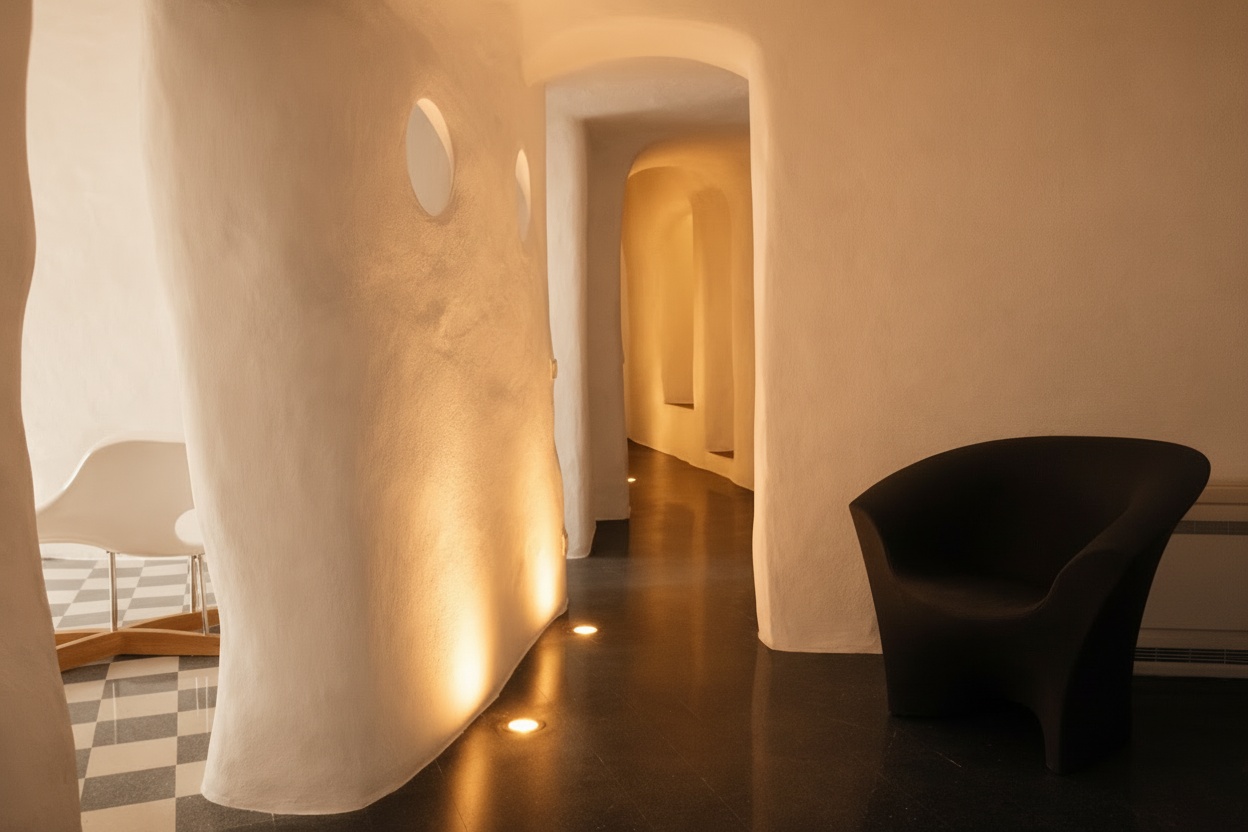 La sua opera, tramandata poi di generazione in generazione, ha dato vita a un'architettura straordinaria dove il tufo e la calce bianca si fondono con la roccia naturale, creando ambienti di rara suggestione. Volte ottocentesche, nicchie scavate a mano, pavimentazioni in graniglia d'epoca.